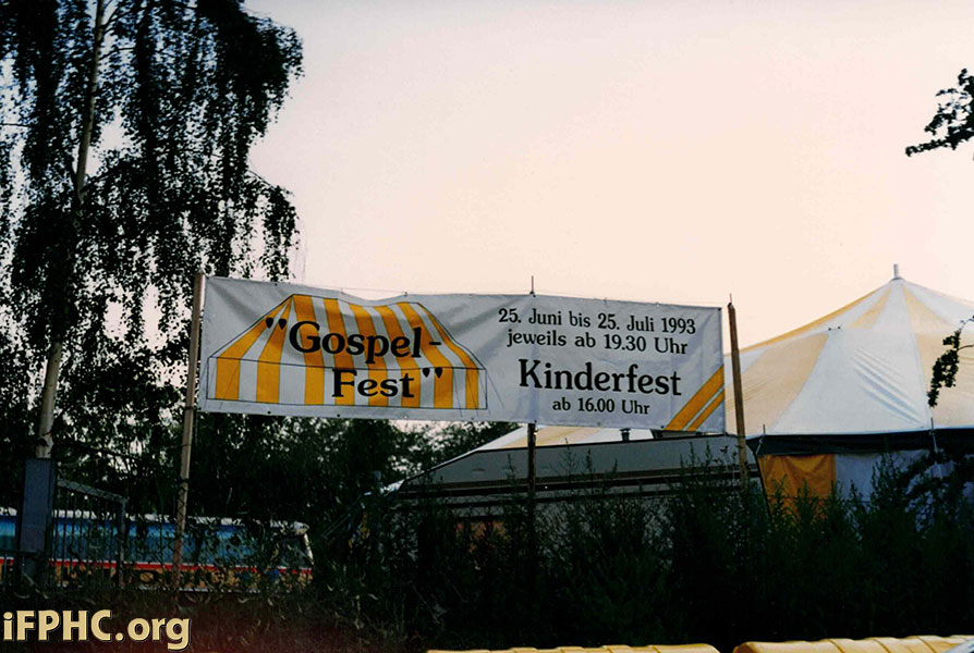 Description: Sign and tent for 'Gospel Fest,' a Pentecostal evangelistic outreach in Löbau, Germany, July 25, 1993. AG missionaries Karl-Heinz and Renate Heistermann participated in the outreach.