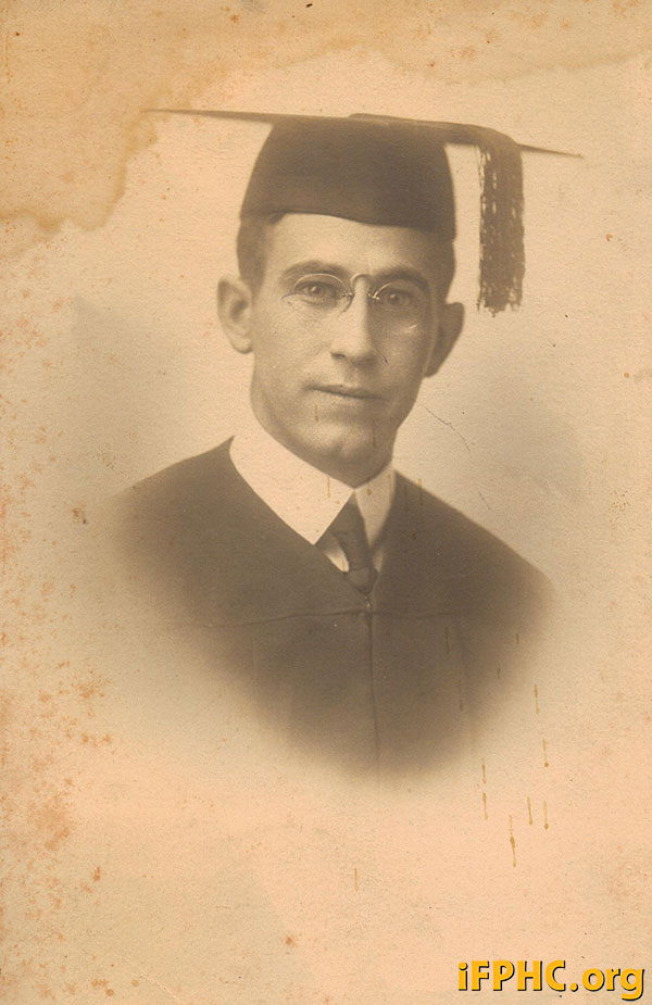 Description: Elmer F. Muir, portrait, head and shoulders, wearing a cap and gown, circa 1917.